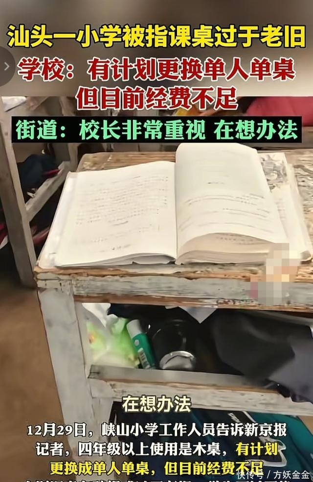 这种木桌是属于双人桌好多木桌因为年代久远也已经掉了皮坑坑洼洼的孩子书写很不方便,至于为什么没有换新桌子学校给出的原因是因为没有钱,随后街道办的工作人员也帮忙圆场说校长很重视这件事情,正在积极想办法有了钱立马就换